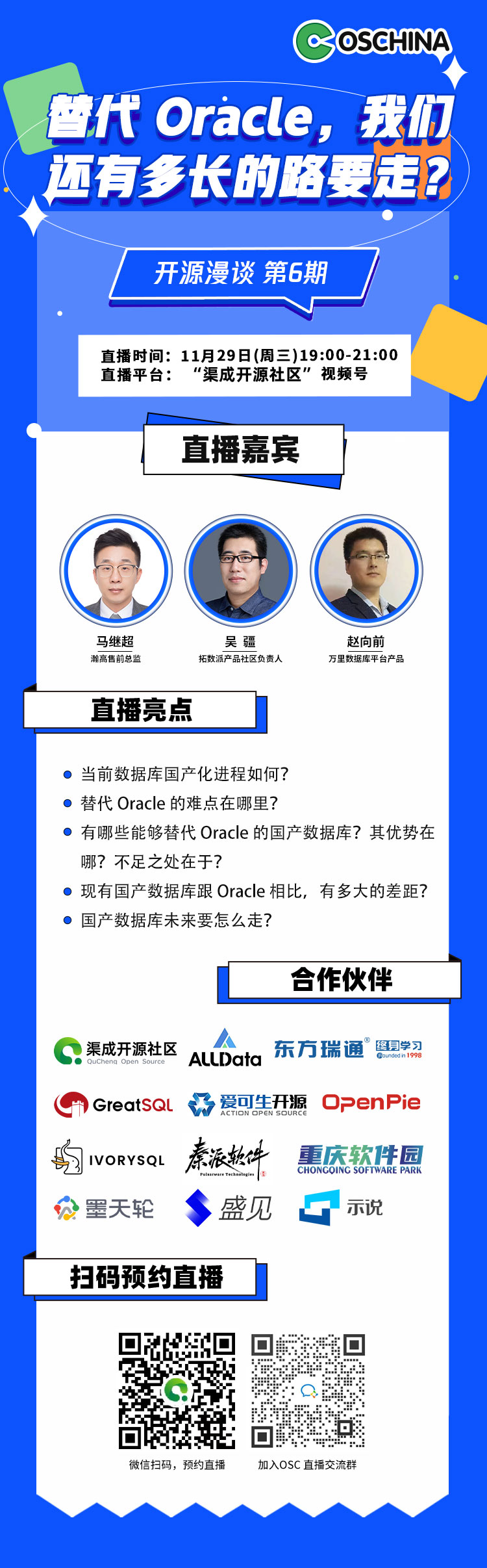 11 月 29 日 19:00,OSCHINA 直播 ——【开源漫谈】第 6 期,将深入地聊一聊:替代 Oracle,我们还有多长的路要走?