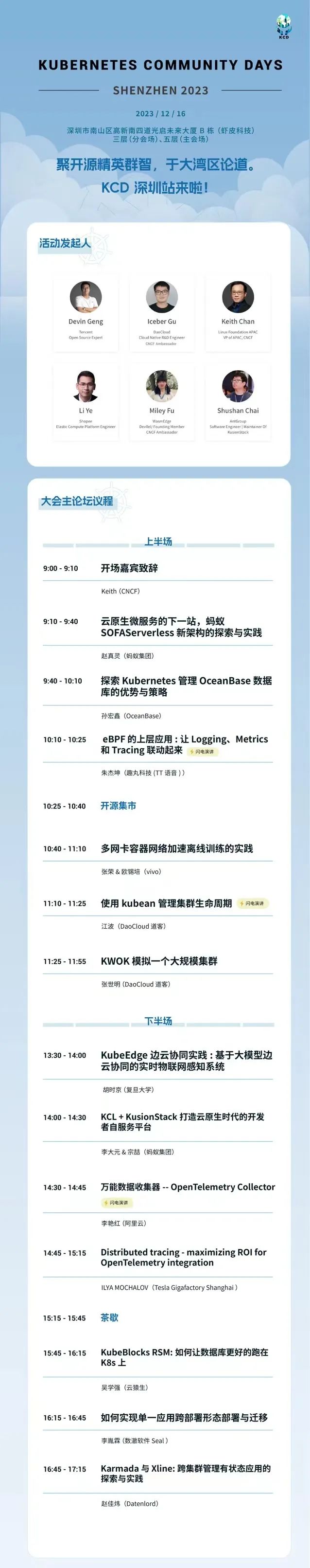 官方也于去年将云原生技术列为深圳的重点支持领域,为了让云原生技术与大湾区中的深圳特区相遇并吸收其活力,也让大湾区的开发者更便捷的参与的云原生技术的发展讨论中,我们决定于 2023 年 12 月 16 日在深圳举办一场云原生盛会— Kubernetes Community Days (KCD) 2023 深圳站!