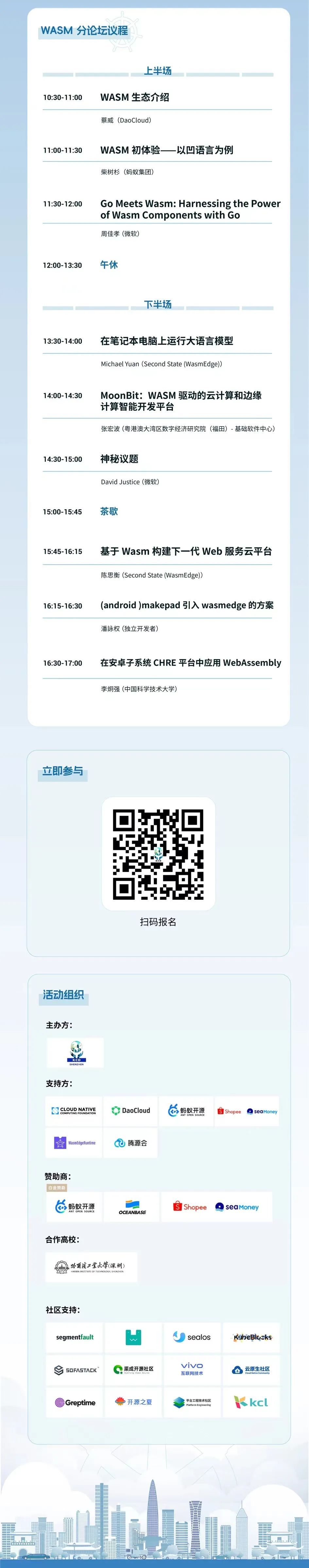 如果你想与 Kubernetes 、eBPF、kubean、KWOK、容器网络加速、KubeEdge、KCL、数据收集器、DevOps、KubeBlocks RSM、Xline 等领域的开发者共同探讨交流。或是你正在为 WASM 生态系统做出贡献、正在使用 WASM 为你的基础设施提供动力或想要了解 WASM ,都千万不要错过本次 KCD 深圳站!