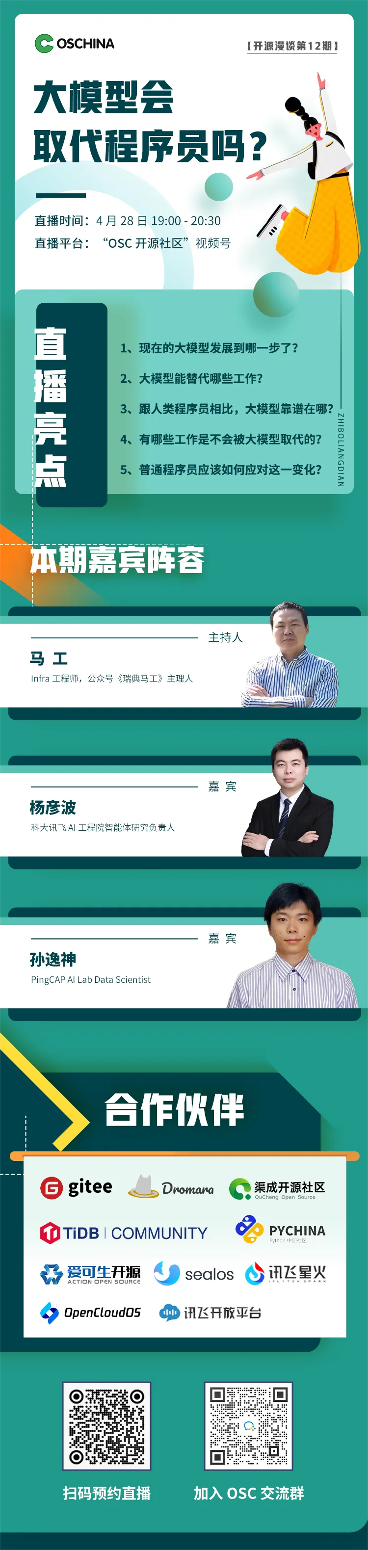 你用过哪些 AI 编码工具?你觉得它能取代人类程序员吗?快扫码预约直播,一起听听大佬们的分享吧!还可以进我们的 OSC 技术交流群,一起抱团取暖~