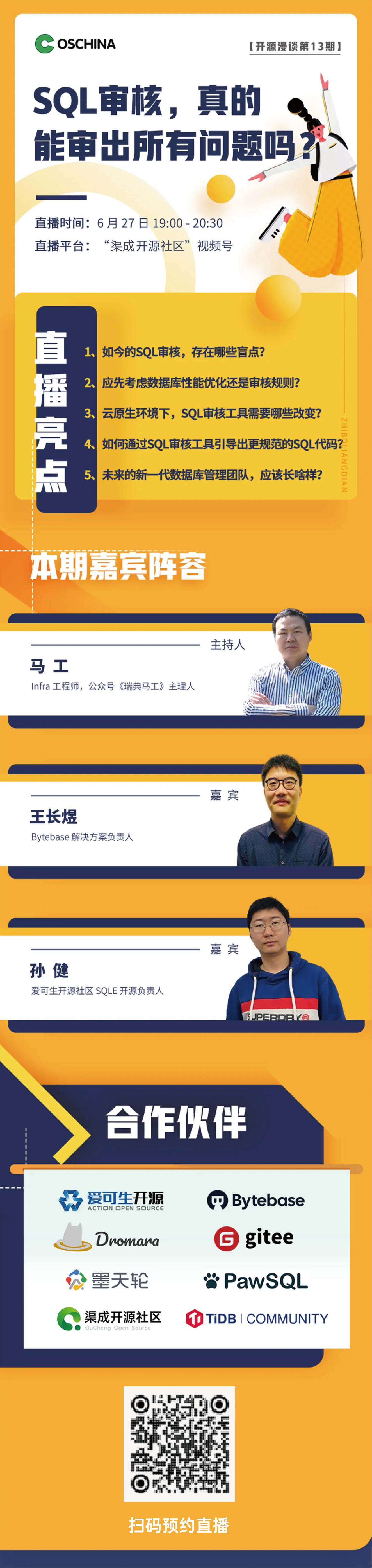 如今的 SQL 审核,真的能审出数据库的所有问题吗?要确保数据质量,到底需要怎样的工具、团队和流程?快扫码预约直播,一起听听大佬们的分享吧!