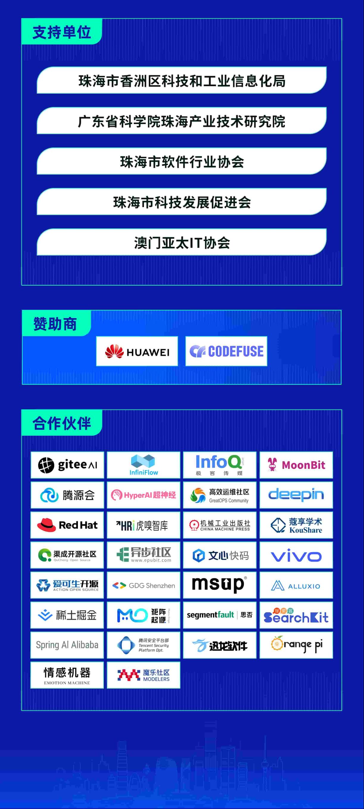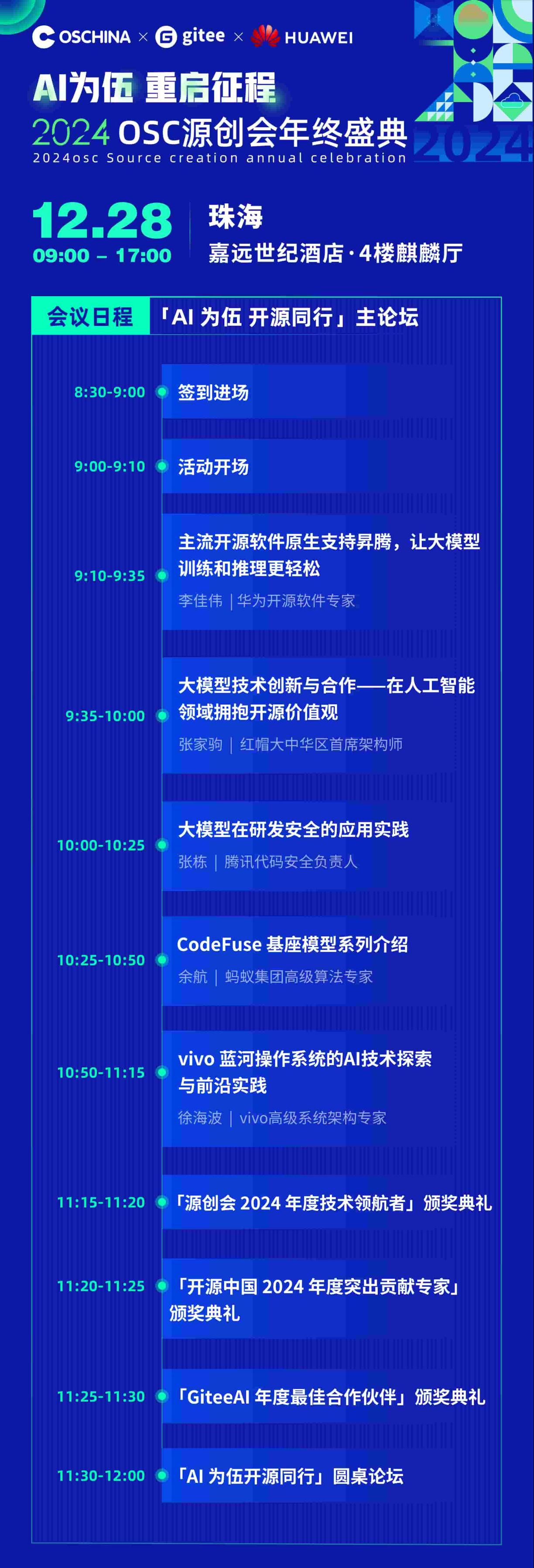 本届盛典由开源中国、Gitee主办,华为联合主办,珠海市香洲区科技和工业信息化局、广东省科学院珠海产业技术研究院、珠海市软件行业协会、珠海市科技发展促进会、澳门亚太 IT 协会支持,将于 12 月 28 日在珠海嘉远世纪酒店举办。