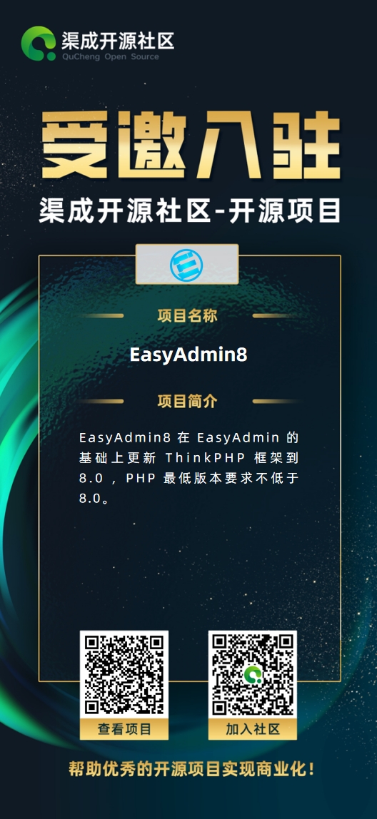 EasyAdmin8 在 EasyAdmin 的基础上更新 ThinkPHP 框架到 8.0 ,PHP 最低版本要求不低于 8.0。