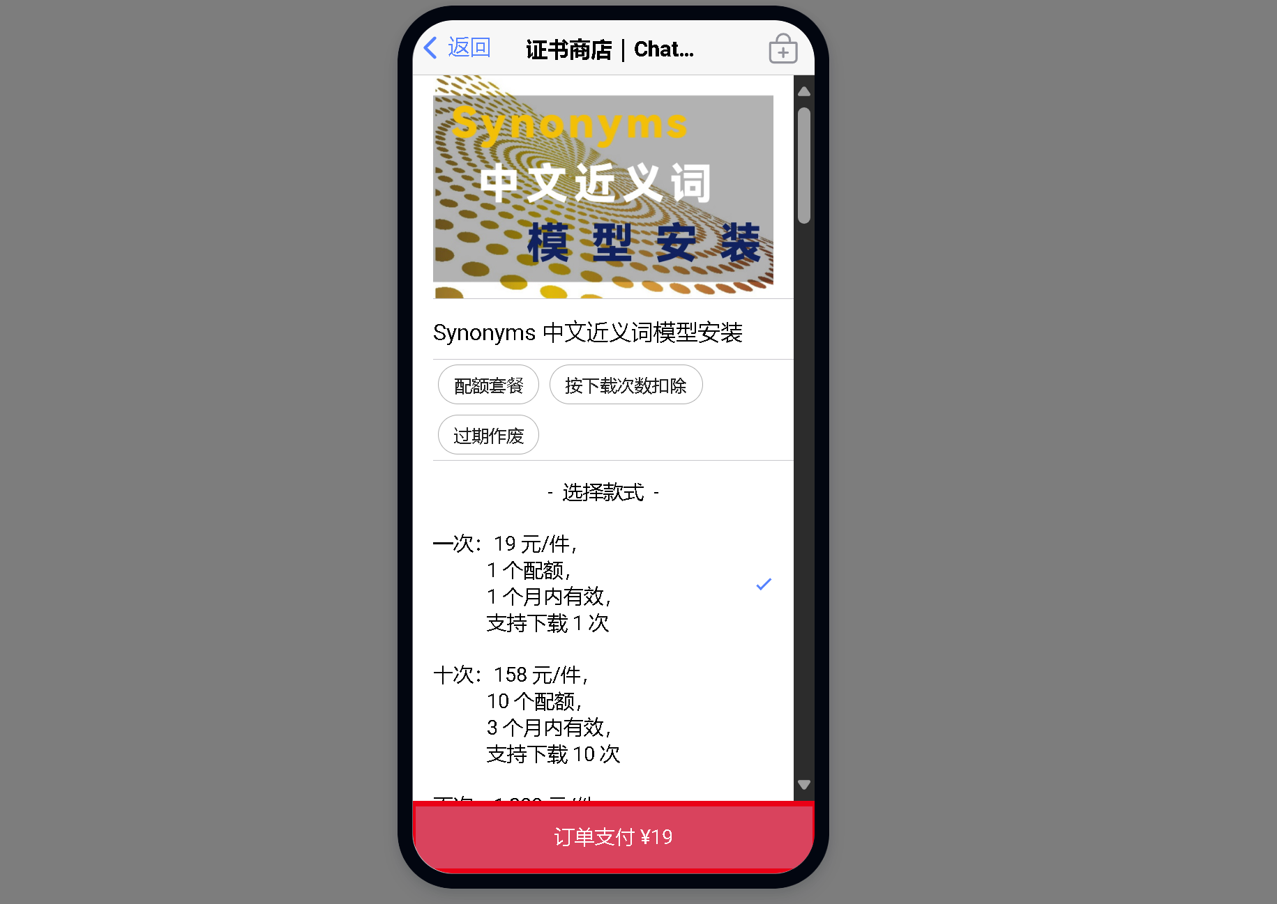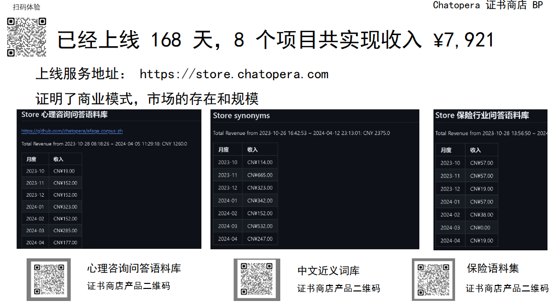 首先, 在 Chatopera 证书商店上,上架了几个测试项目,用于验证市场的存在、评估市场规模。比如,这三个项目的付费资源属于机器学习预训练模型和自然语言处理语料集。