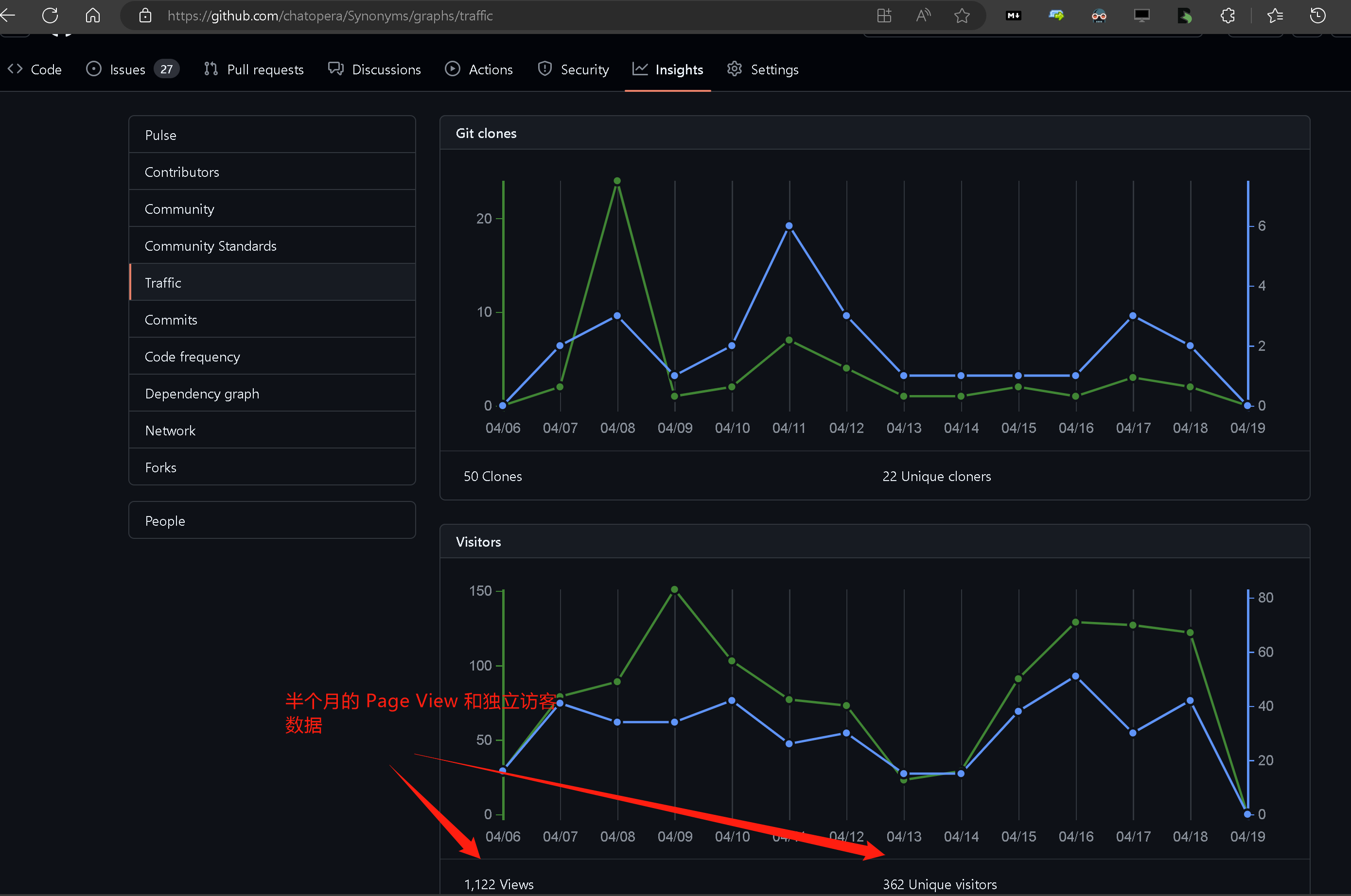 首先,根据上架项目在 GitHub 上的流量,分析转化率,比如以下是中文近义词 Synonyms 的曝光情况。