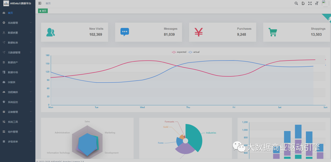 立意:通过数字化,数据中台,为中小企业的商业成功提供数据基石。背景:项目来源于Apache众多开源项目,以及Github开源自由度比较高的项目,alldata过去3年着重于技术调研与研究实践,未来3年着重做数据中台与人工智能的相关方向。