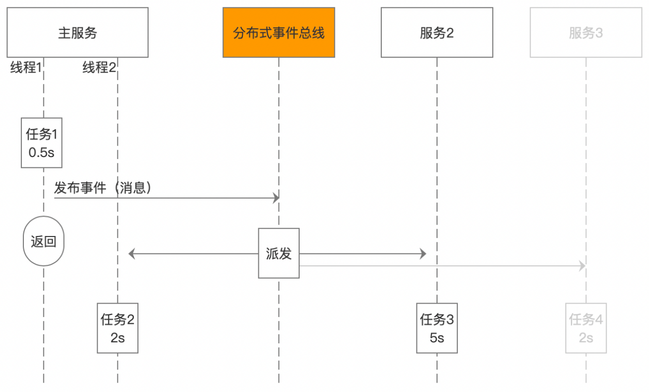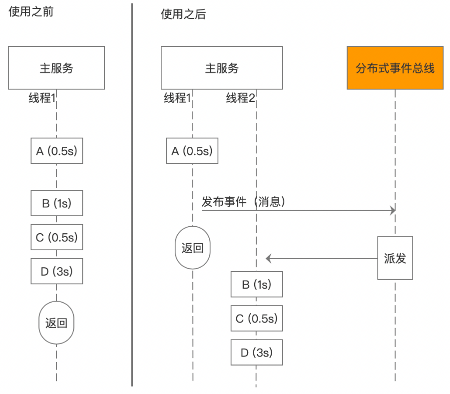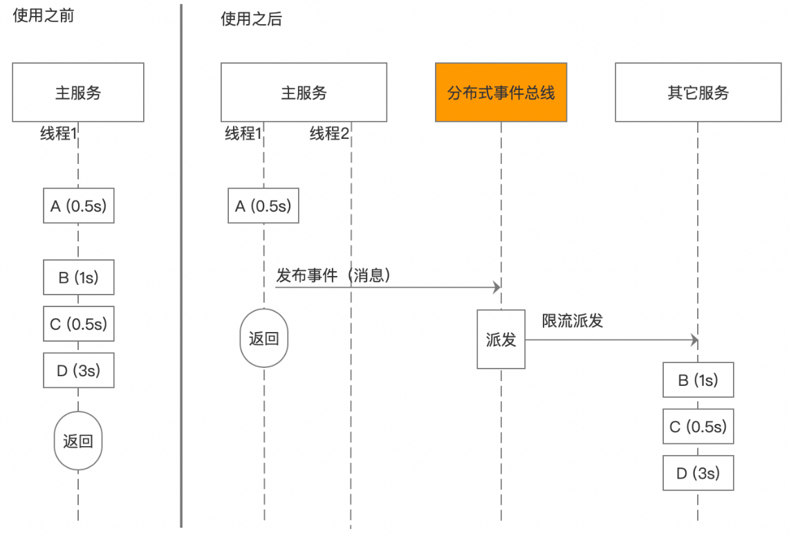比如我们的一个接口处理分为四段代码,别分耗时:A 段 (0.5s),B 段 (1s),C 段 (0.5s),D 段 (3s)。如果同步响应的话,用户一共需要等待 5s,这个体验肯定不怎么好了。我们可以借分布式事件总线,做完 A 后,发一个事件,由事件订阅者再去完成 B,C,D;那用户的感觉就是 0.5S 就完成了,体验就会比较好。(如果是单体,可以自己订阅;如果是分布式,可以由其它服务订阅)