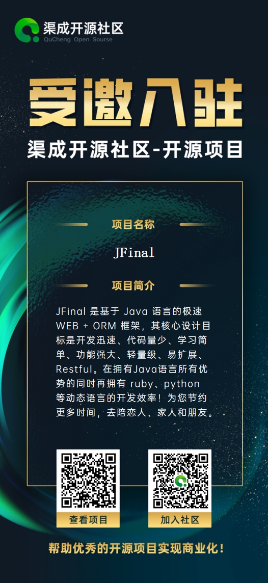 JFinal 是基于 Java 语言的极速 WEB + ORM 框架,其核心设计目标是开发迅速、代码量少、学习简单、功能强大、轻量级、易扩展、Restful。在拥有Java语言所有优势的同时再拥有 ruby、python 等动态语言的开发效率!为您节约更多时间,去陪恋人、家人和朋友。JFinal有如下主要特点
