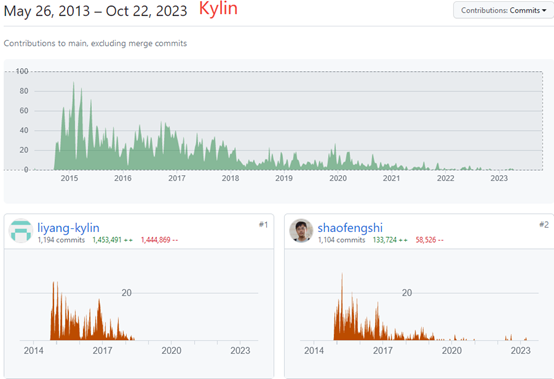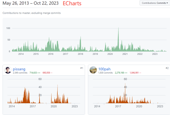 Apache Kylin是第一个中国人主导的顶级项目,我还有幸参加过他们的宣讲会。自Kylin以后才陆续有中国的开源项目捐献给ASF。但从数据来看,这个项目已经基本上不更新了。排名前两位的关键提交者已经基本上不参与这个项目了。再来看看Echarts项目,情况稍好一些,但2023年更新也明显减少了。
